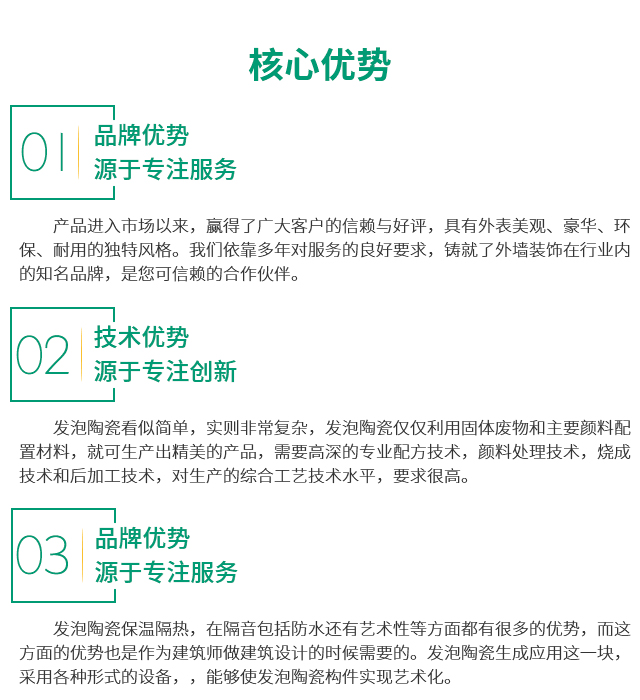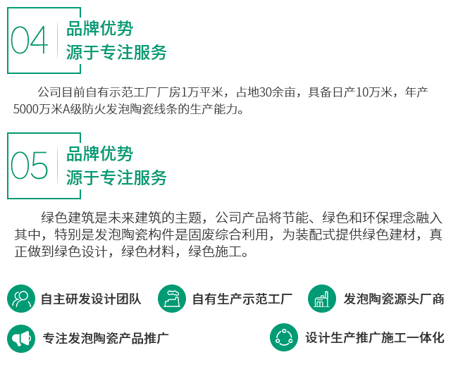 公司利用新型节能环保材料——发泡陶瓷设计生产的外墙线条装饰构件、外墙保温装饰一体板、防火阻燃隔墙板,具有轻质、高强、耐老化...